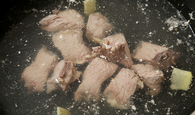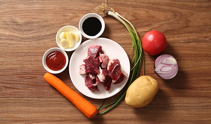 番茄、胡蘿卜、洋蔥切塊,土豆切塊泡水,牛腩切塊,備用。