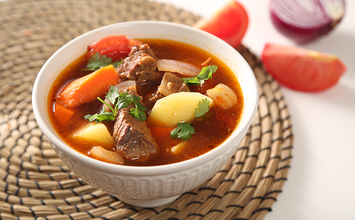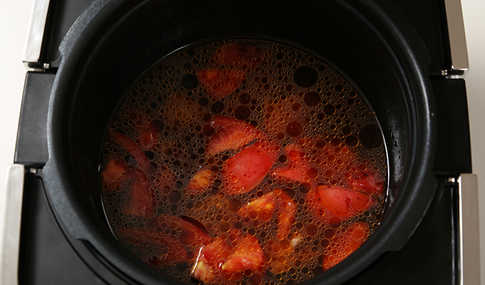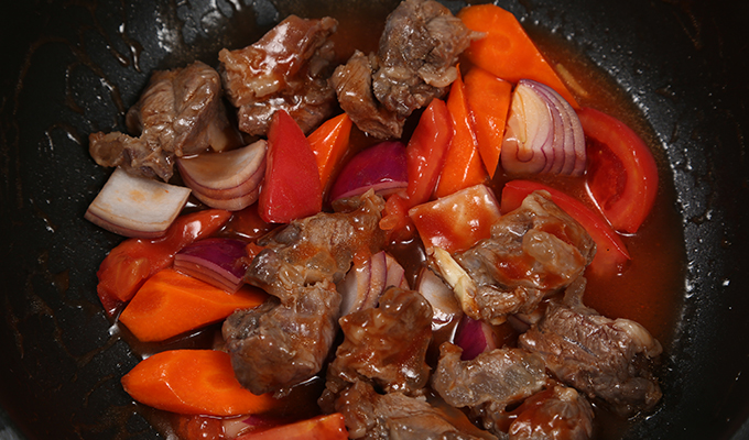 起鍋倒食用油,加姜煸炒,加入番茄、洋蔥翻炒,加入焯好水的牛腩、番茄醬、老抽,翻炒片刻。