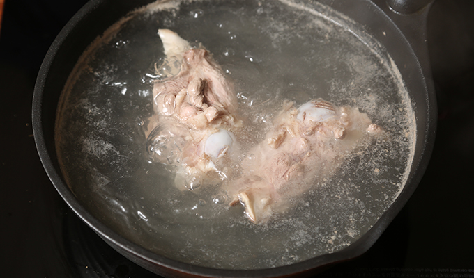 豬骨洗凈,冷水入鍋,加入姜、料酒,焯水。