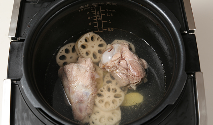 將豬骨、蓮藕、姜片、蔥段和水一起放進壓力鍋中,蓋上蓋子;煲湯。