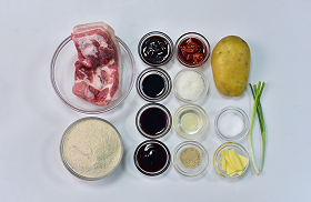 五花肉200克,蒸肉米粉100克,土豆50-100克,老抽10克(1/3湯勺),生抽10克(1/3湯勺),料酒10克(1/3湯勺),姜3片,腐乳1塊,甜面醬15克(半湯勺),蔥2根,胡椒粉少許,食鹽少許
