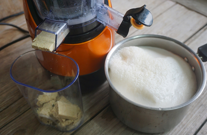用原汁機榨取豆漿與傳統的石磨磨漿較為相似,泡發的黃豆與清水在螺旋刀頭的低速轉動下,化成濃白的豆漿,汩汩而出。操作簡易輕松。