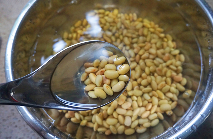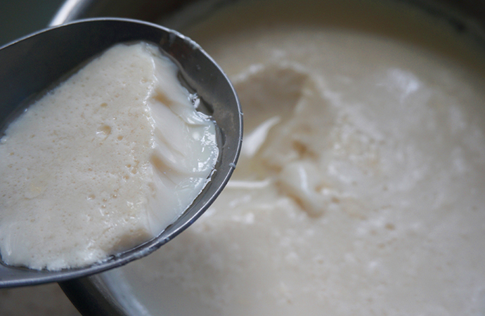 自制豆腐腦,并不難。選用非轉基因黃豆,浸泡一夜后,可用低速研磨的原汁機榨取豆漿,過濾后煮沸,再點上內脂,靜候十分鐘便可吃上香濃嫩滑的豆腐腦。