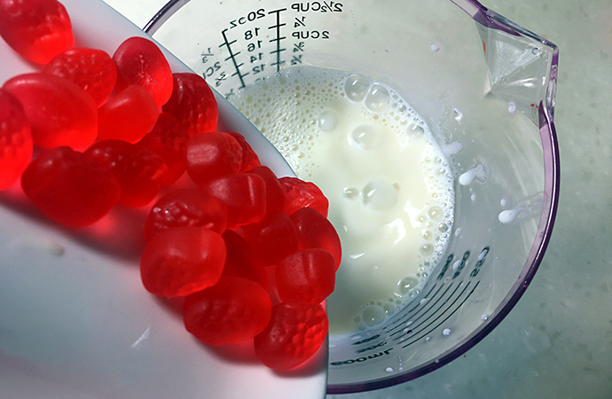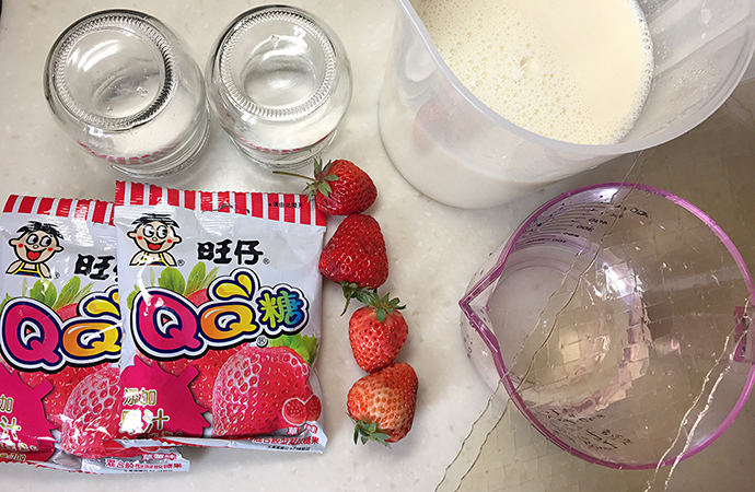 (2)草莓味:草莓味QQ糖140g(兩袋)、豆?jié){290ml。成品容器:200ml容器/4瓶。(可選用玻璃杯、玻璃罐,口徑寬更適合)