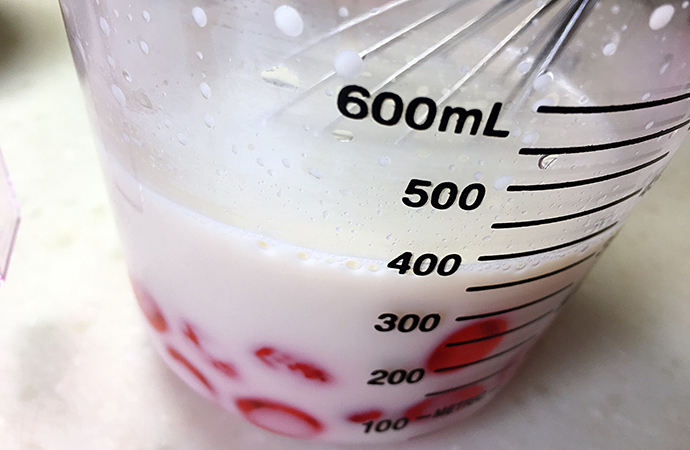 9、(2)草莓:70度豆?jié){290ml,加入草莓QQ糖140g,攪拌至糖全部溶解。過篩備用