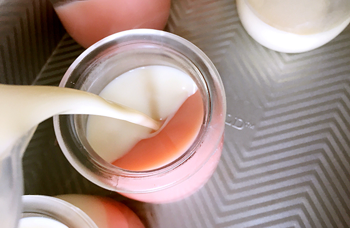 10、布丁瓶斜著躺在烤盤內(nèi),注入草莓豆乳布丁液,送入冰箱速凍定型30分鐘