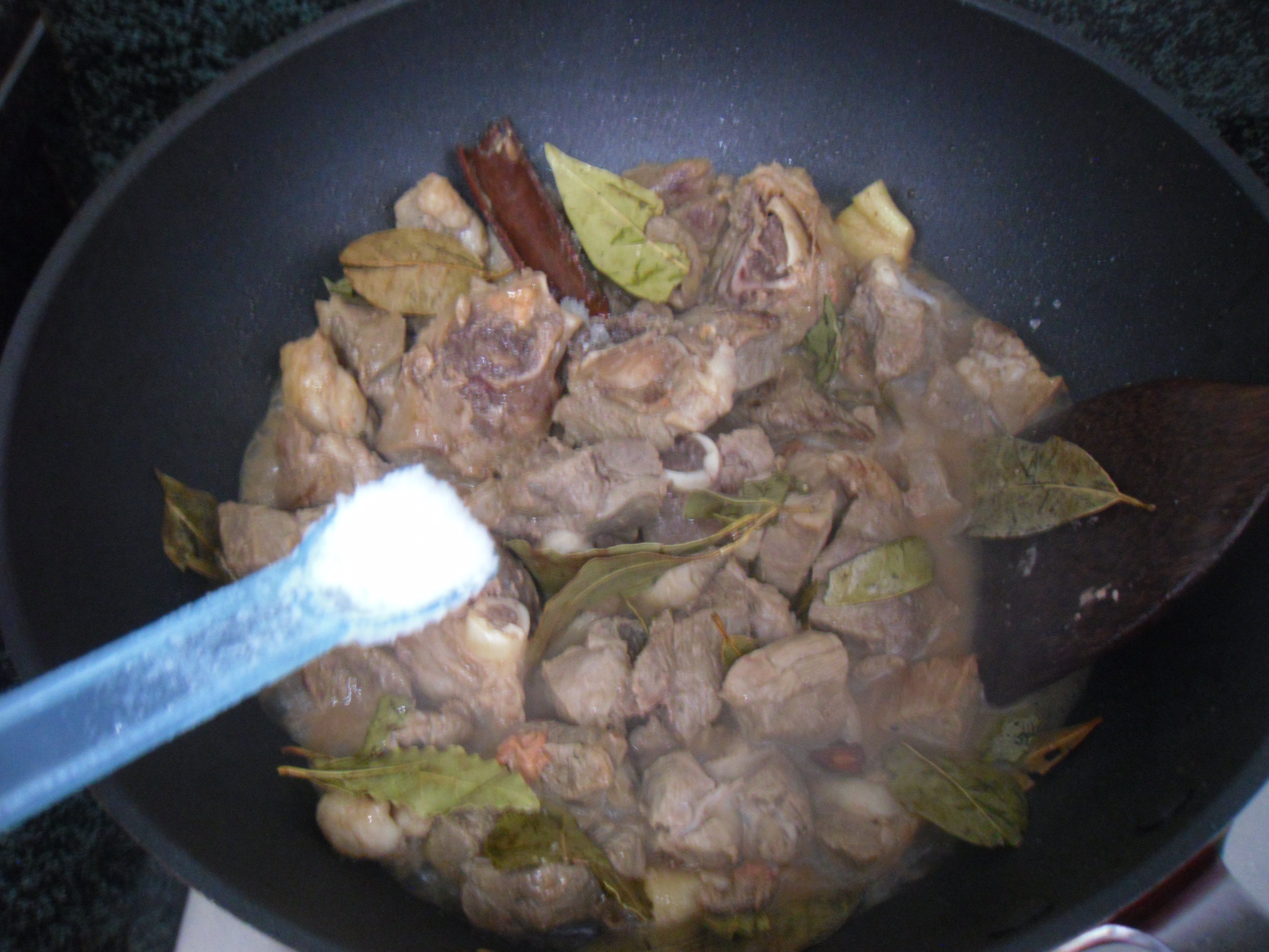 7. 倒入香葉、八角、桂皮、南乳,翻炒均勻