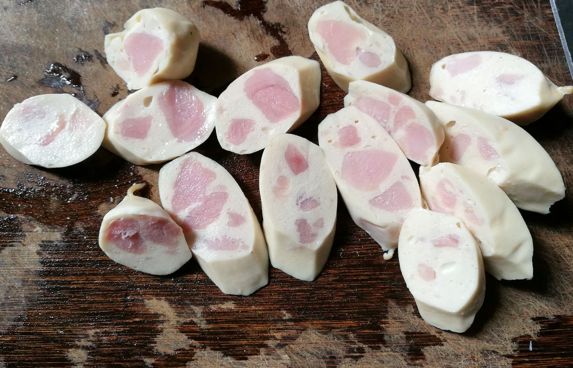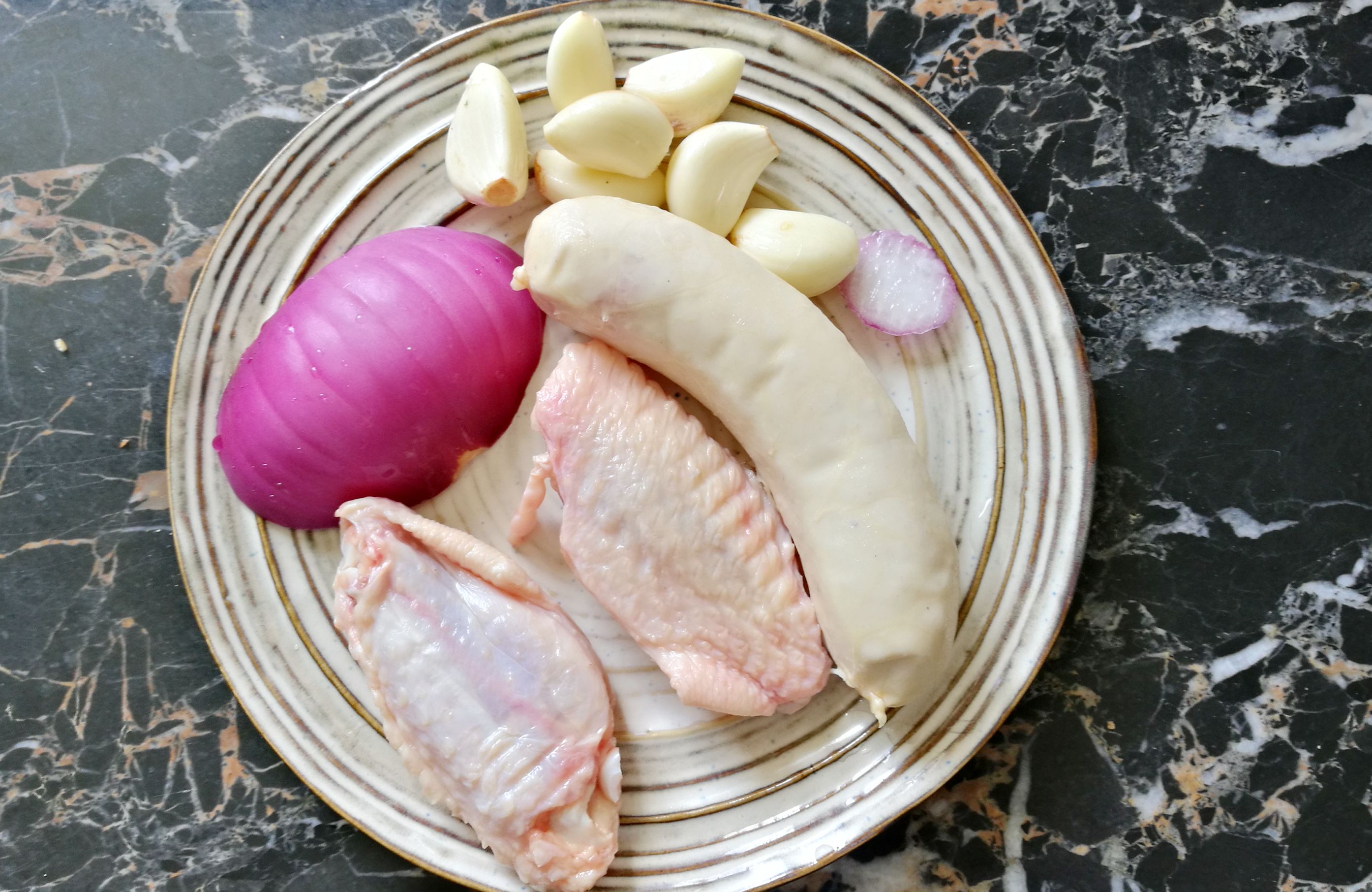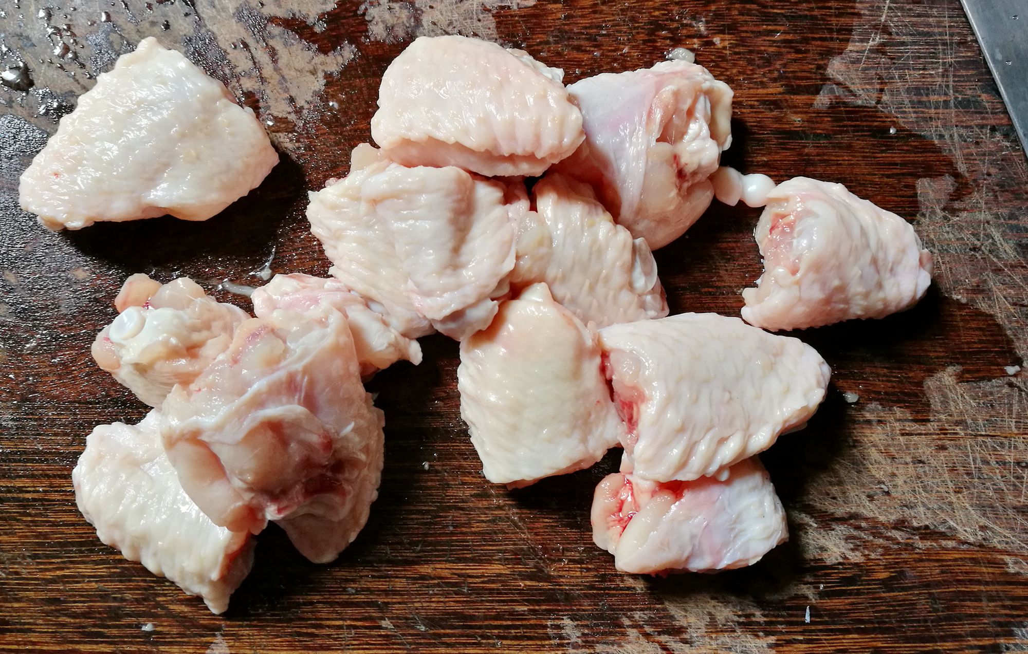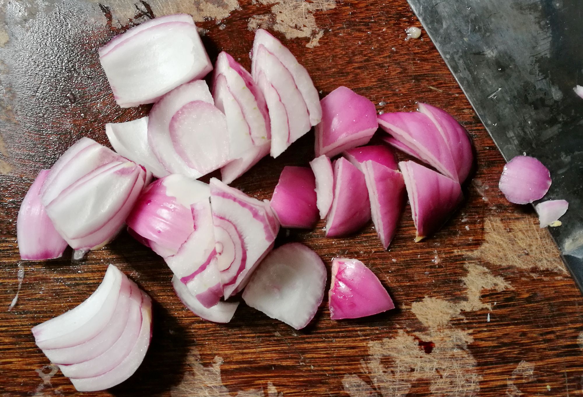 1、金槍魚腸切塊,翅中對(duì)半切開(kāi),洋蔥切滾刀狀