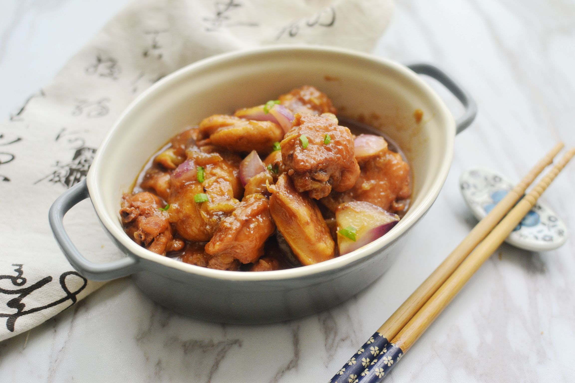 4、加入洋蔥繼續(xù)炒香(留少部分最后用),加入雞翅,魚腸;