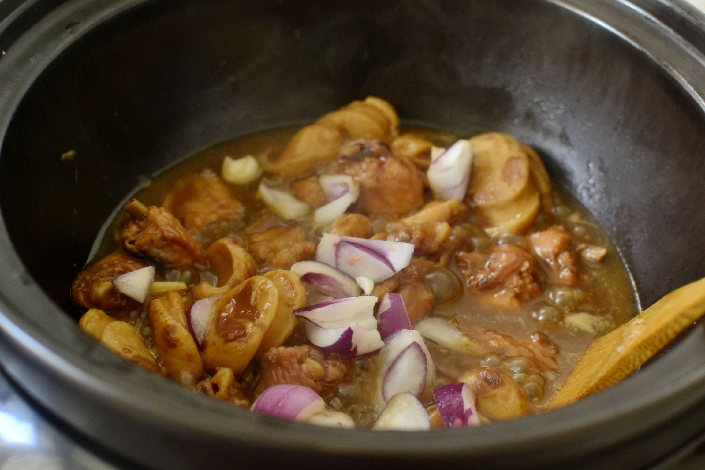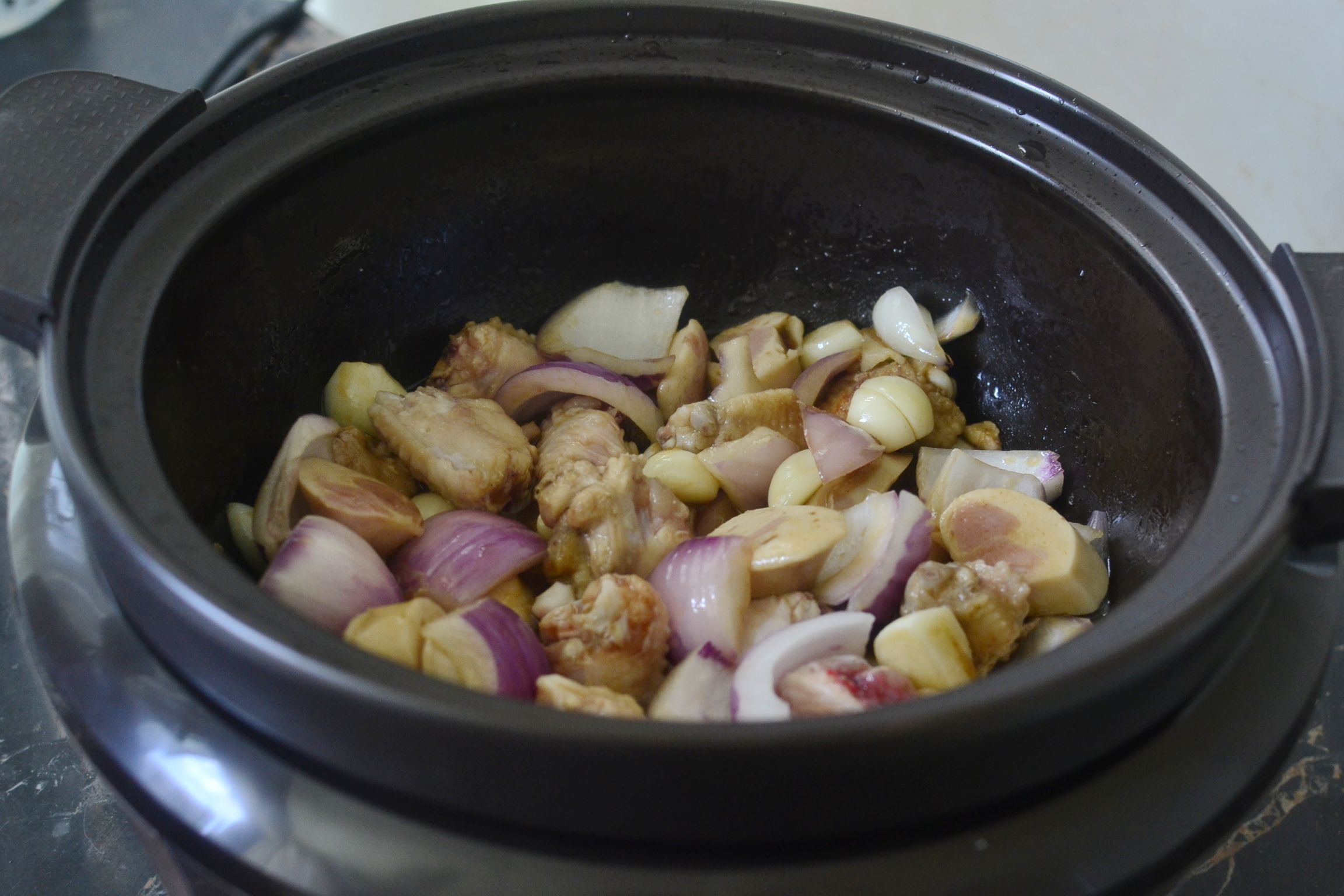 5、然后加入調(diào)料,水,加蓋燉煮;