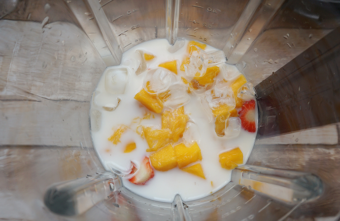 【主料】:草莓20顆、芒果1個、冰塊適量、牛奶60g