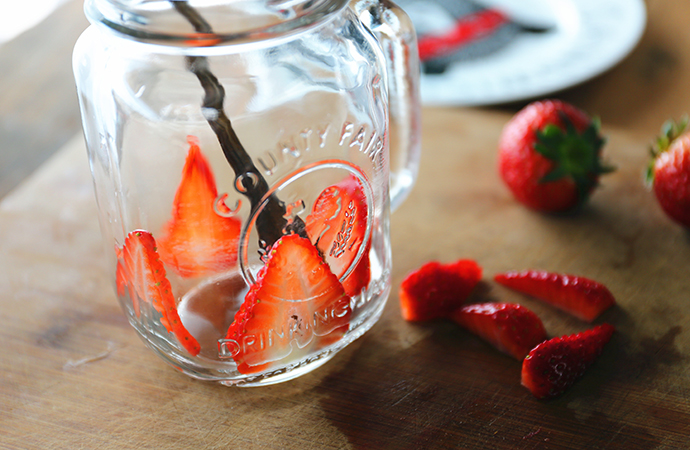 4、用木勺輔助,把草莓片貼在玻璃杯內(nèi)側(cè)