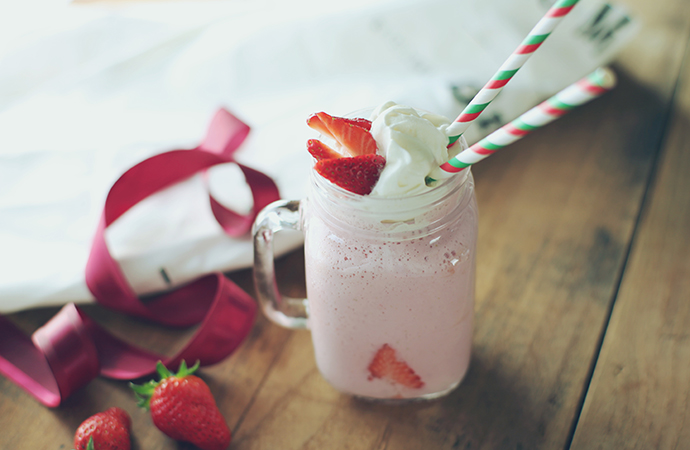 9、接著倒入杯中,擠上一坨奶油,再點綴點草莓,插上吸管。就完成咯