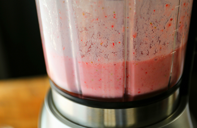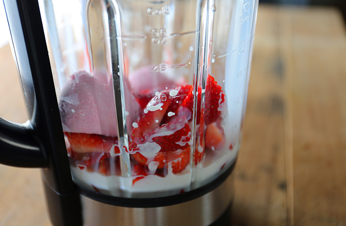 6、將草莓、草莓冰激凌、牛奶、少量檸檬汁(抗氧化)一同倒入蘇泊爾破壁機中