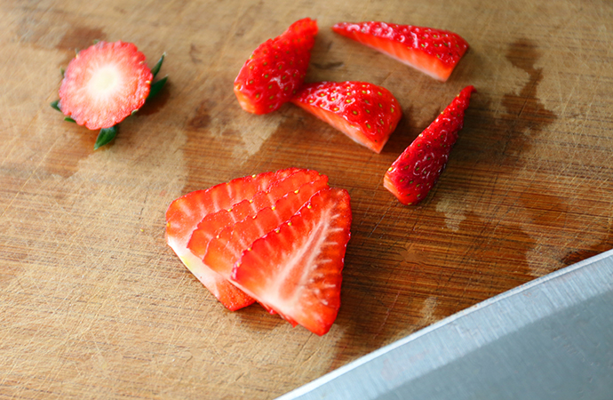 3、取一個大點的草莓,去蒂,從中間向兩邊切四片薄片,剩下的部分從中間切開備用