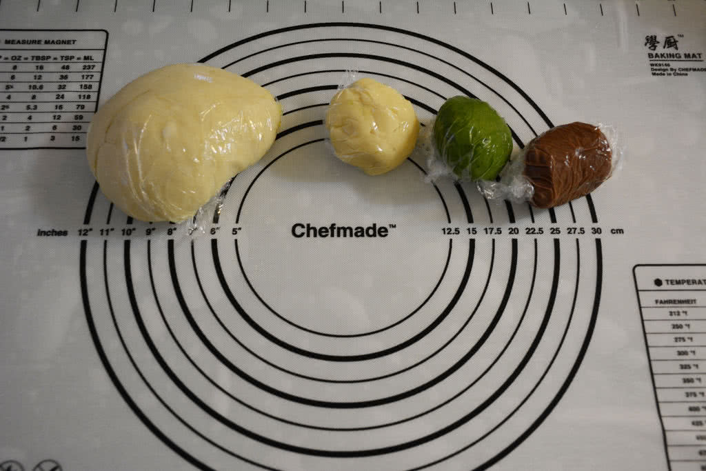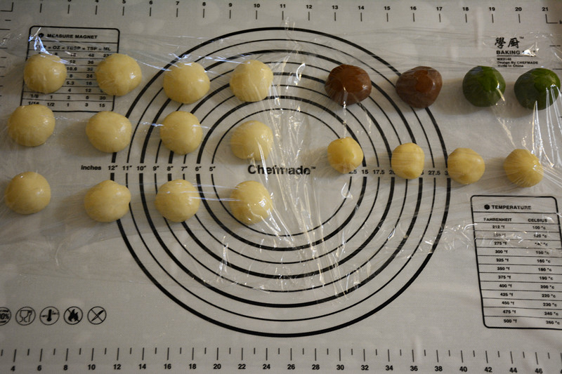 4. 揉好油皮后,蓋上保鮮膜。接著準(zhǔn)備油酥。將油酥材料混合在一起,揉至均勻,蓋上保鮮膜松弛30分鐘。我是做了三種口味,所以我將油酥分成三等份,一份加入可可粉5g,一份加入抹茶粉5g.我用的若竹的抹茶粉,顏色很純正,所以加5g做出來的顏色就很綠色,很漂亮。