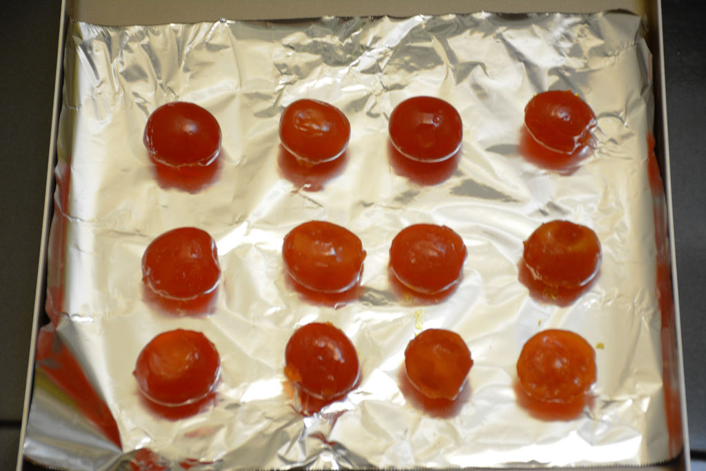 5. 咸鴨蛋去殼去掉蛋清,蛋黃清水沖洗表面一層膜,然后噴上少許白酒,烤箱170度烘烤5分鐘,放涼待用。
