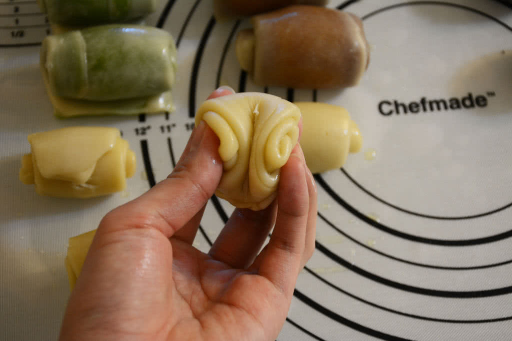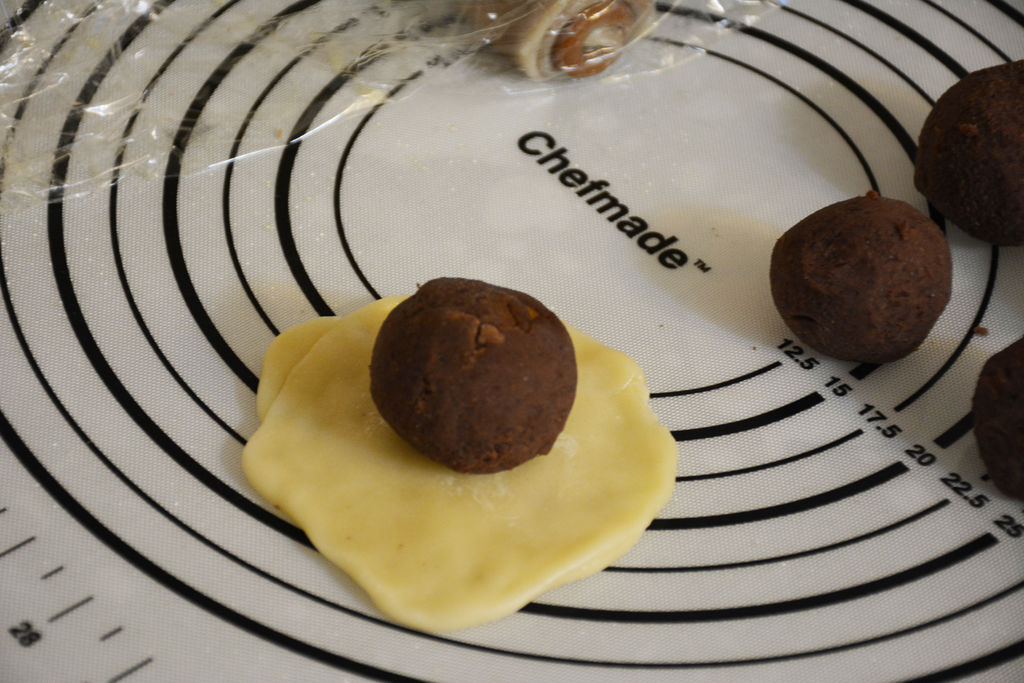 7. 取一份油皮搓圓壓平,包入一份原味油酥包緊收口。注意包的時候,油皮慢慢往上推,知道全部包裹好,收口捏緊。
