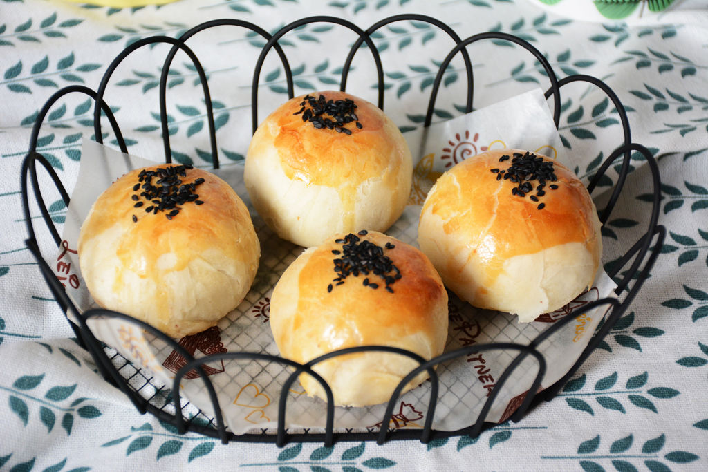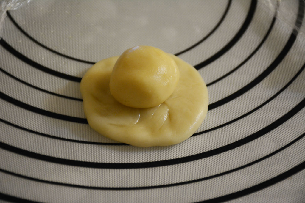 13. 收口朝下,壓扁之后用搟面杖搟成圓形,包入準(zhǔn)備好的豆沙蛋黃餡兒,慢慢收口,慢慢往上推,知道全部包裹好,收口捏緊。