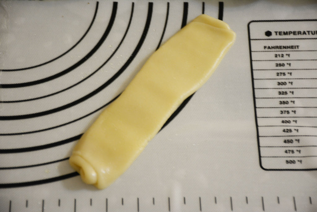 11. 把醒發(fā)好的卷卷壓扁,再一次搟開。注意:第二次搟的時候,不要搟的太寬,盡量成矩形。然后從下往上卷起,全部卷好之后,蓋上保鮮膜繼續(xù)醒發(fā)20分鐘。
