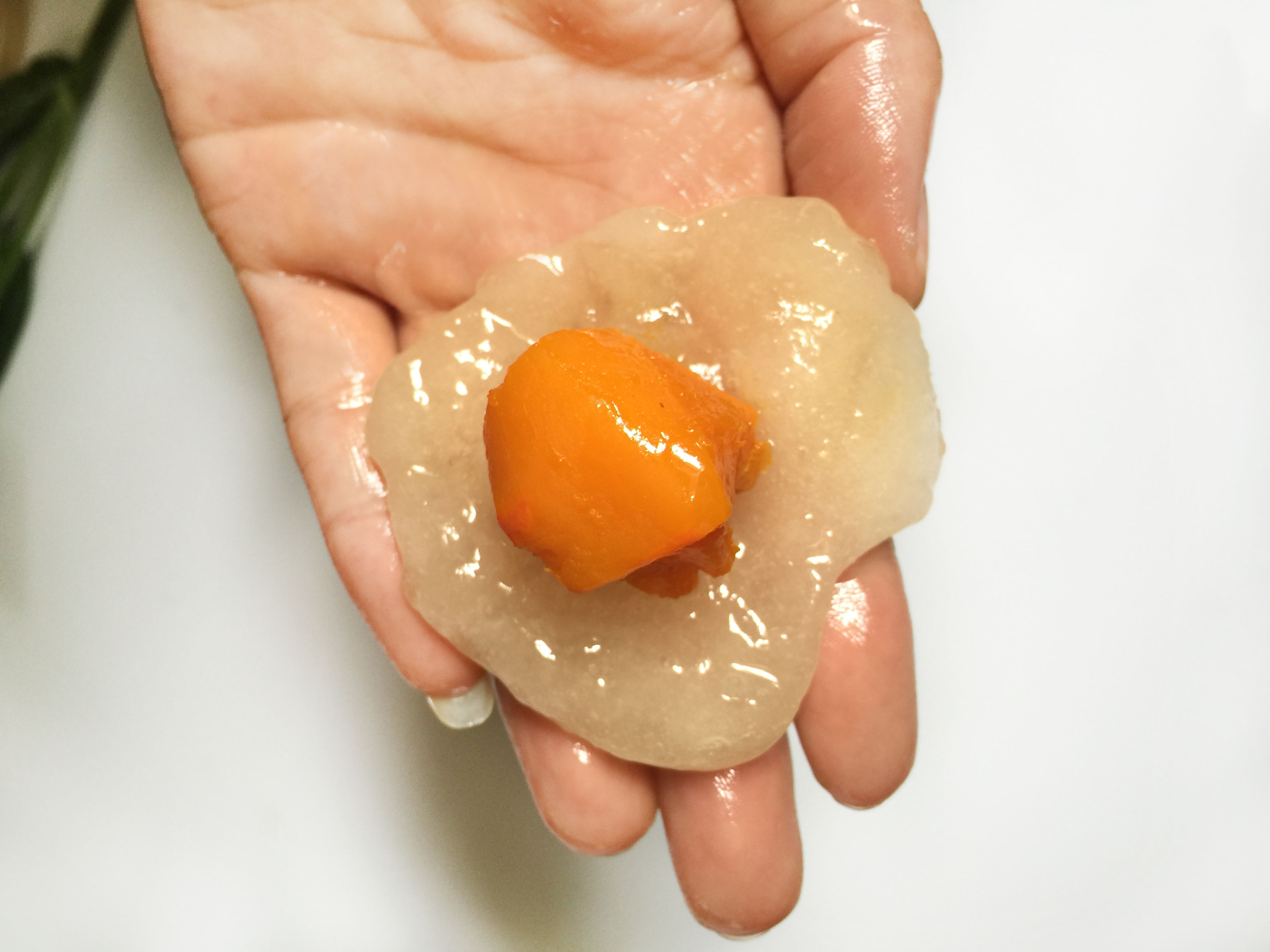 9、 取一個皮的粉團用手掌壓扁,包裹餡料