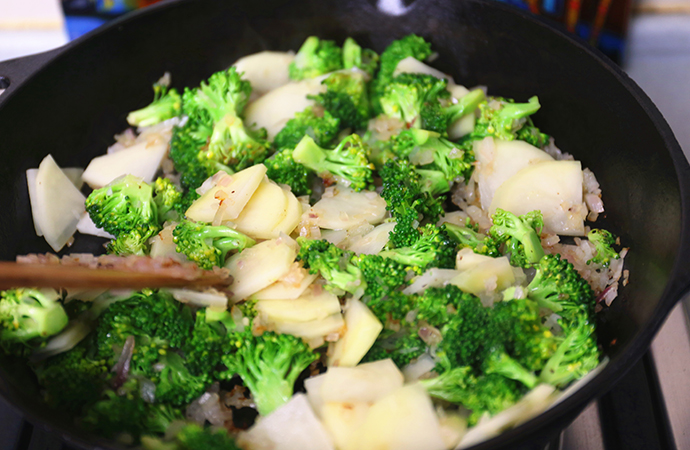 4、熱油,放入洋蔥碎炒香,加入西蘭花碎、土豆片、百里香、香葉翻炒均勻