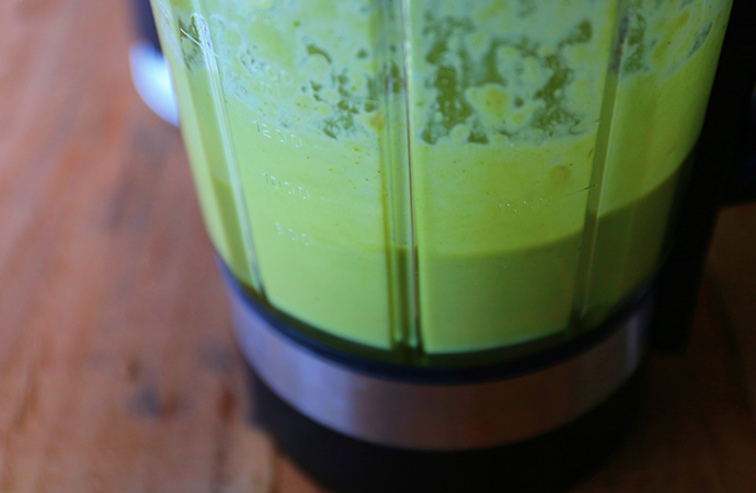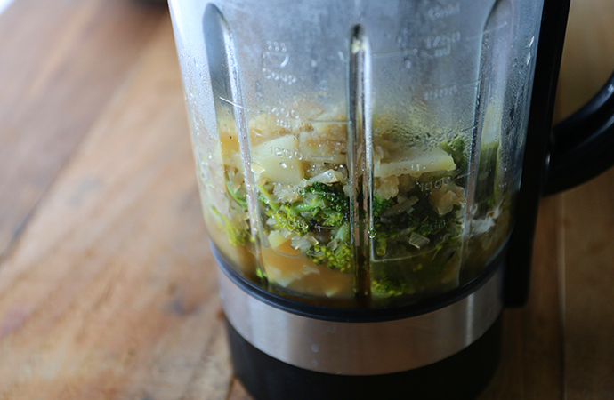 6、后撈出香葉,將煮好的西蘭花湯用破壁攪打均勻