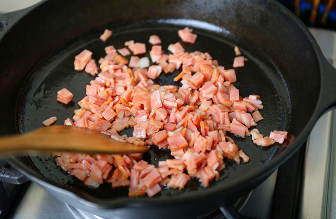 3、放橄欖油燒熱,放入培根碎丁均勻翻炒,至培根干脆后盛出備用
