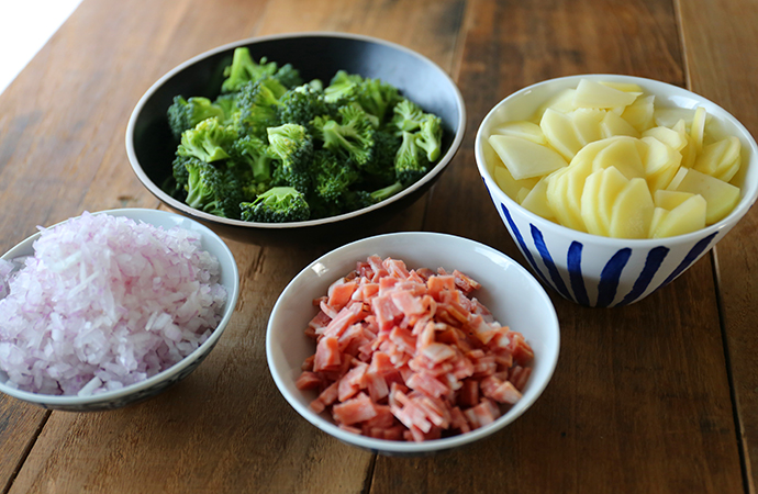 【主料】:西蘭花1個、培根3片、洋蔥半個、土豆1個